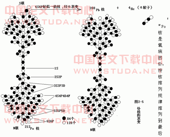 212 Po 核的质子排列顺序为:1S 2 2S 2 2P 6 3S 2 3P 6 3D 10 4S 2 4P 6 4D 10 4F 14 5S 2 5P 6 5D 10 6S 2 6P 4 。最后46P质子在北极排三个后,余1个排在南极的6S上,成为1支不稳定支节。比6P能极大的为7S5F6D,因此,排中子时,按常规将中子排列后余下的中子,其余的就排在下一能极的质子位置上,如7S5F6D上。一直到128个中子排完为此。如图25(祥图与作者联系)。整个核形如一颗多支节有规律支节的大树:上部为支干部分,下部为树根部分; α衰变处正好是树顶上1支幼枝,象被大风吹断一样自然和谐。 经 α衰变后正好成为稳定的S1P2杂化三角结构。